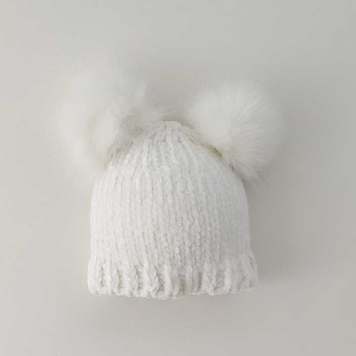 Soft and cozy this hat is hand knit in thick chenille yarn with 2 dyed-to-match furry pom poms.