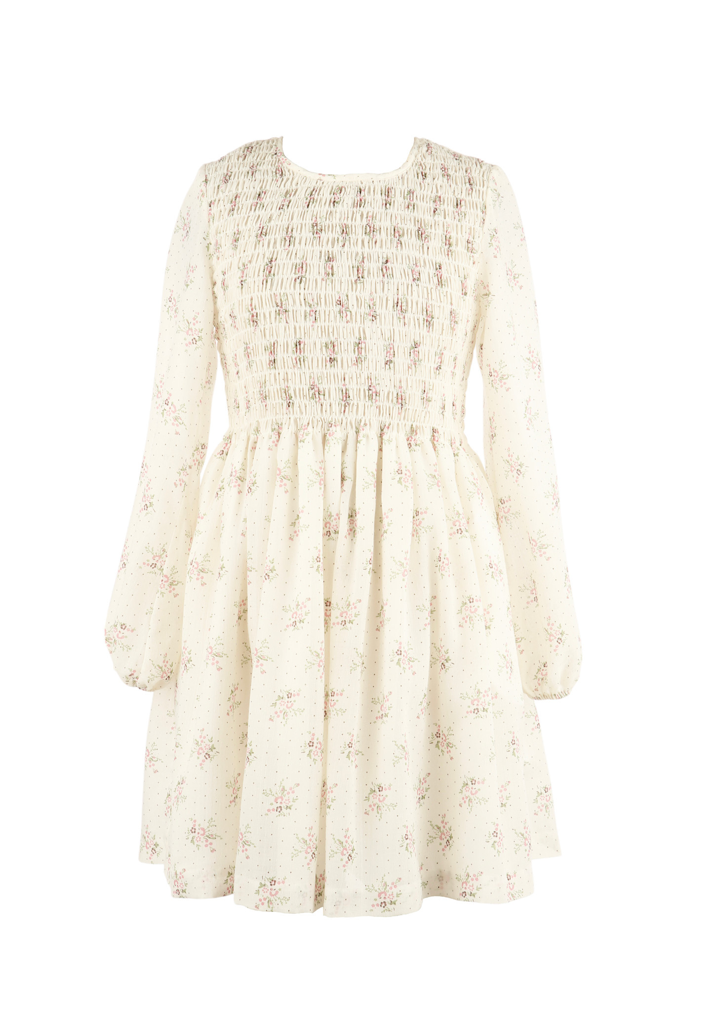 Soft and sweet, this cream floral dress with a smocked bodice and flowy skirt is perfect for school days, parties, or weekend outings. Lightweight and comfy, it’s a must-have for every tween’s wardrobe!