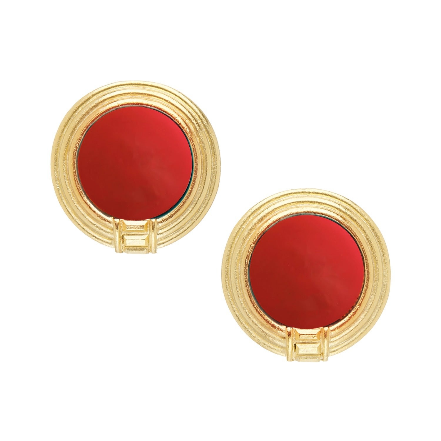 Using the Roma Coin setting but embellished with a variety of stones from glistening Mother of Pearl to deep Black Onyx, these studs are bold, gold, and timeless.