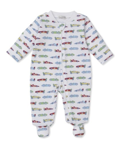 The Kissy Kissy Speedway Zip Footie features a fun race car print on soft, breathable Pima cotton. With a convenient front zipper and covered feet, it offers comfort and ease for bedtime or playtime—perfect for your little speedster.