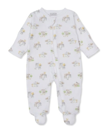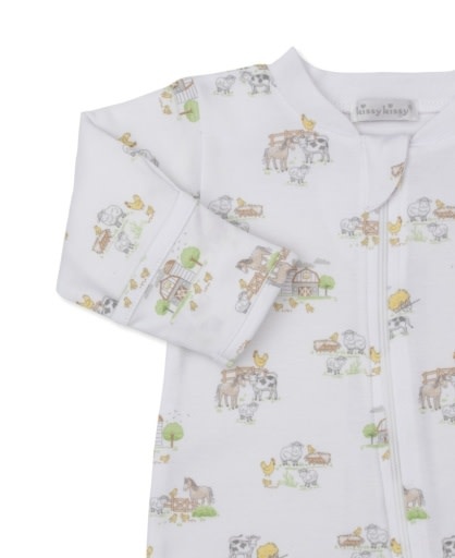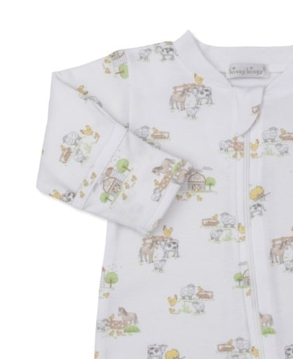Playfully patterned in our Fun on the Farm print, this cozy zippered footie is crafted from the softest Pima cotton for ultimate comfort. Mitten cuffs (PR, NB, 0–3) help prevent scratching. Made in Peru. 100% Pima cotton. Machine wash cold; tumble dry low