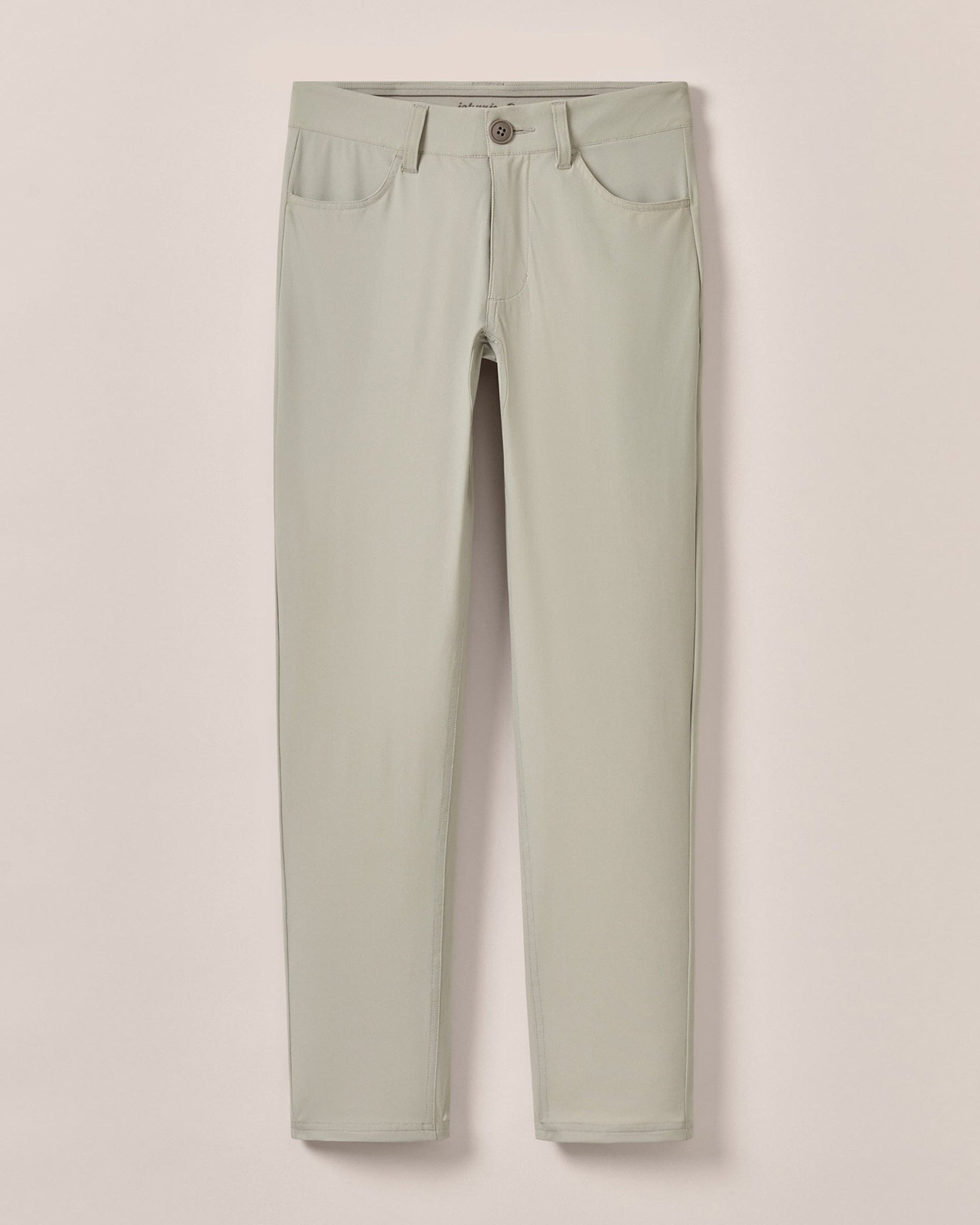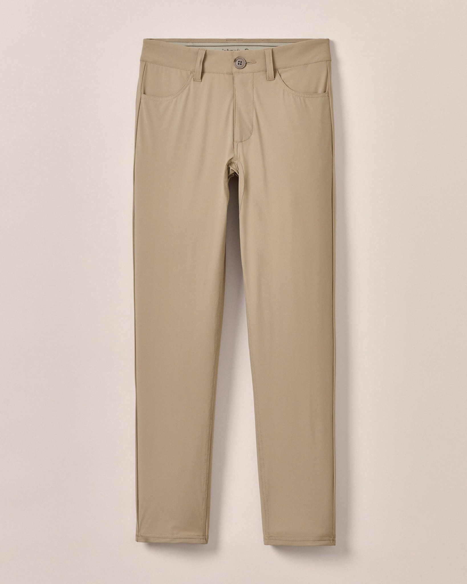 Perfect for the growing little guy, this pant is designed to look the part of a chino style with a faux button at the front but is made with stretch-knit fabric and an elasticized waist that moves with him on the course or on the playground.