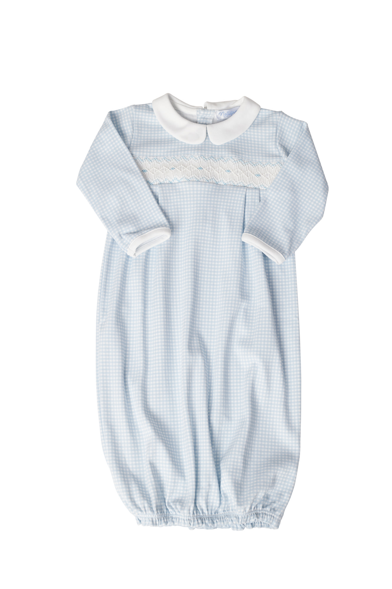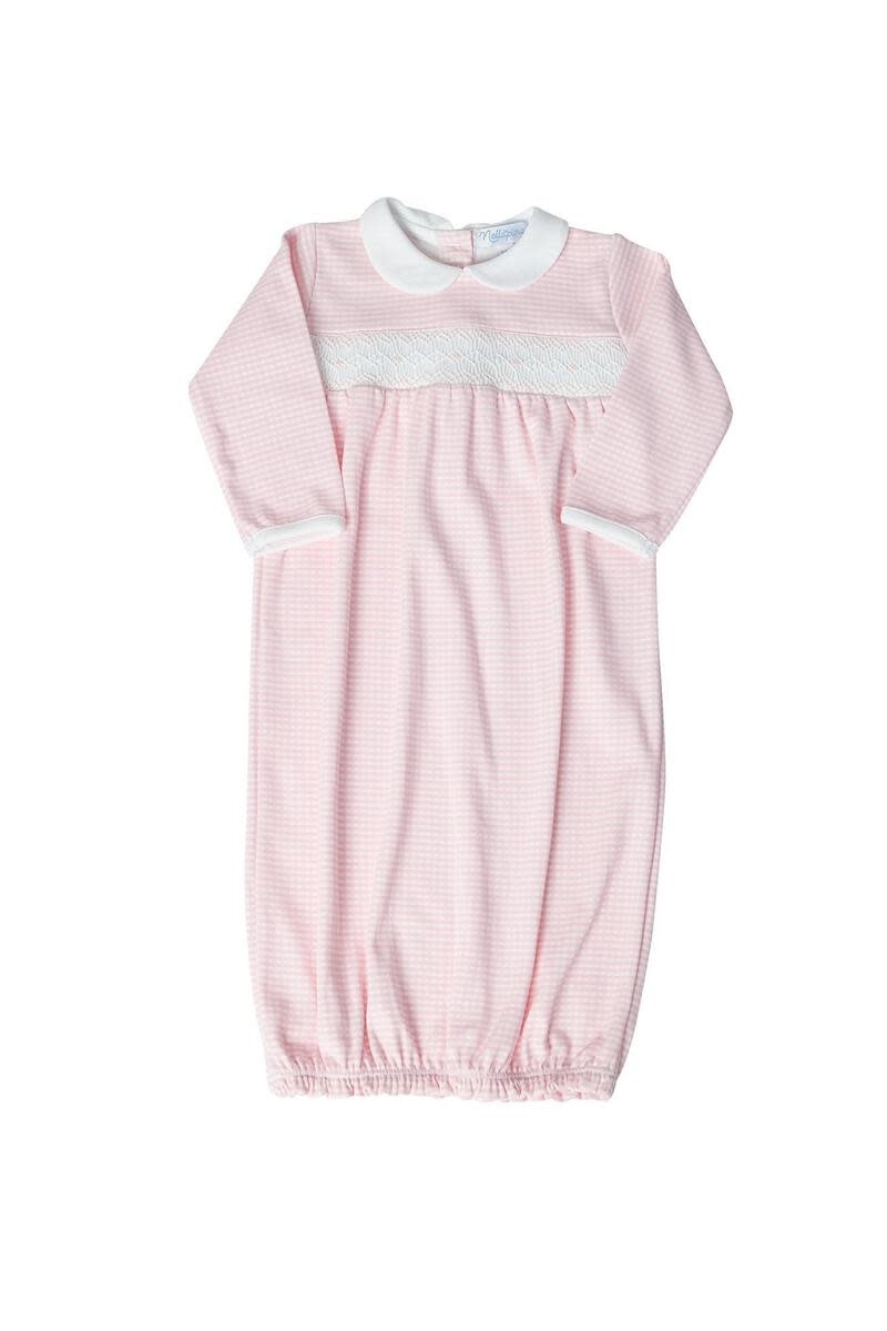 This gown is crafted from 100% Pima cotton and boasts an exquisite Peter Pan collar and delicate hand-smocked details, ensuring your little one's comfort and your convenience.