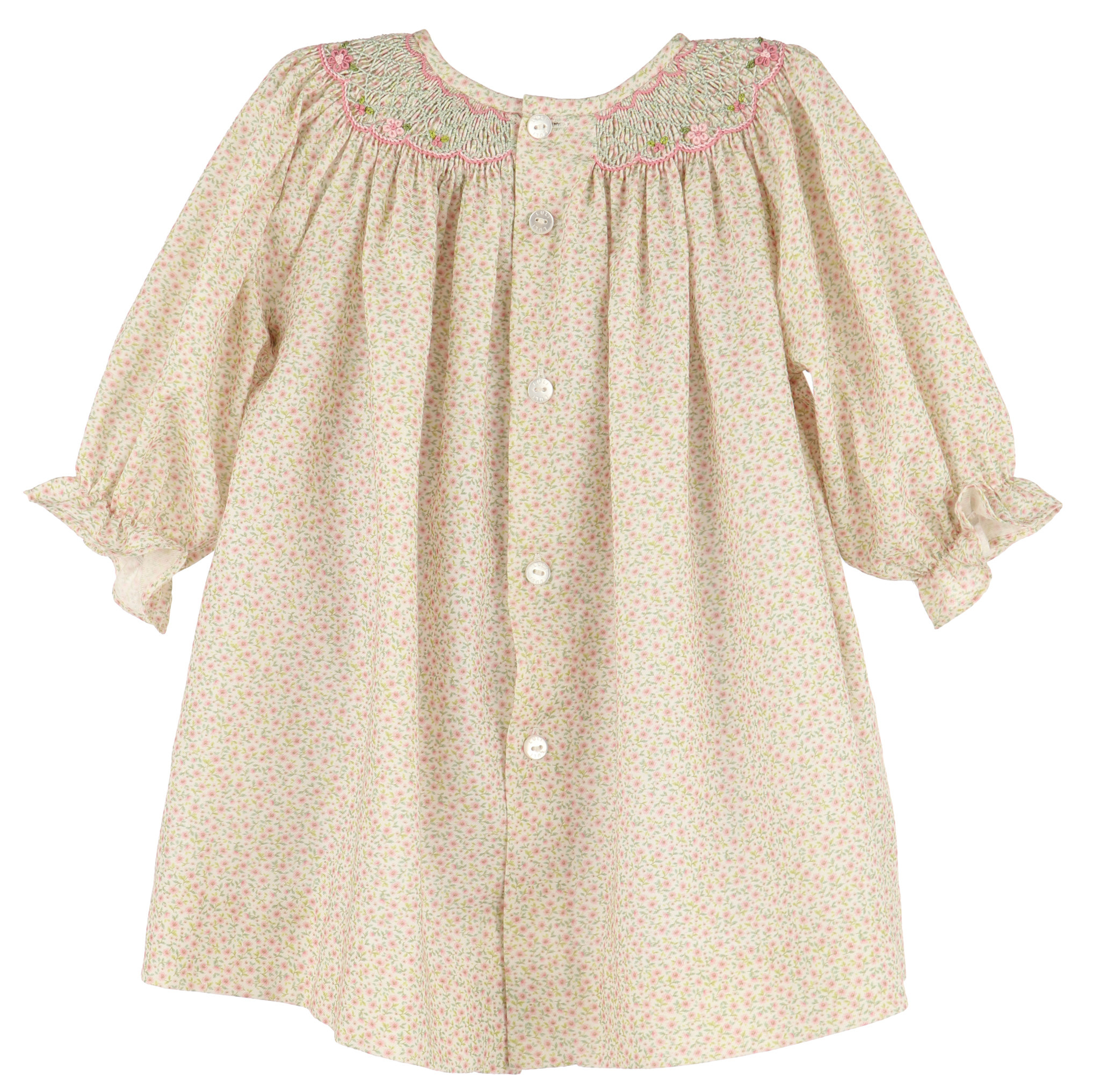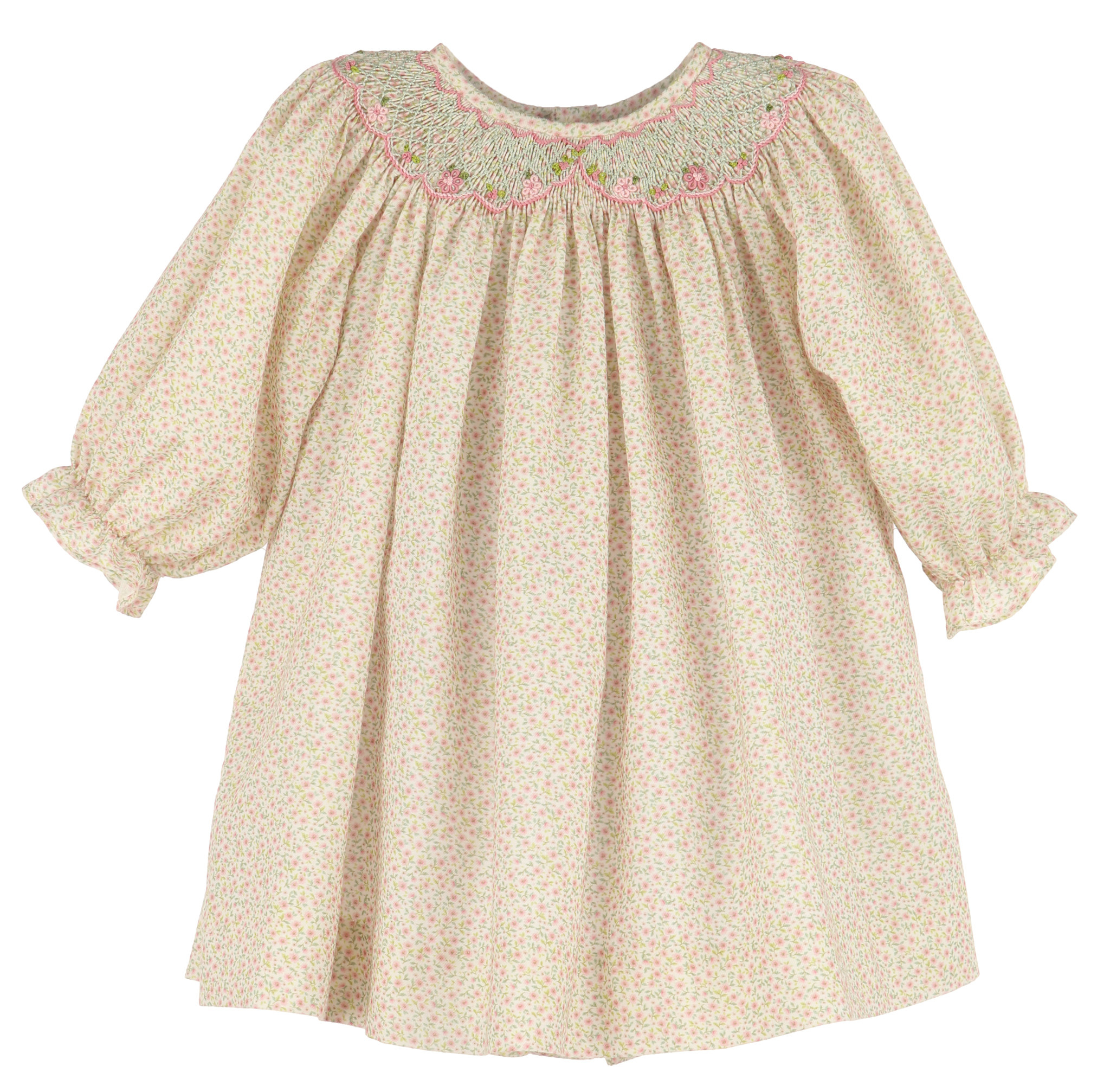 A charming fall floral smocked bishop dress with long sleeves, ideal for cooler days and family photos. Features delicate smocking and rich autumn tones. Pairs perfectly with the matching smocked bubble for an adorable sibling match.