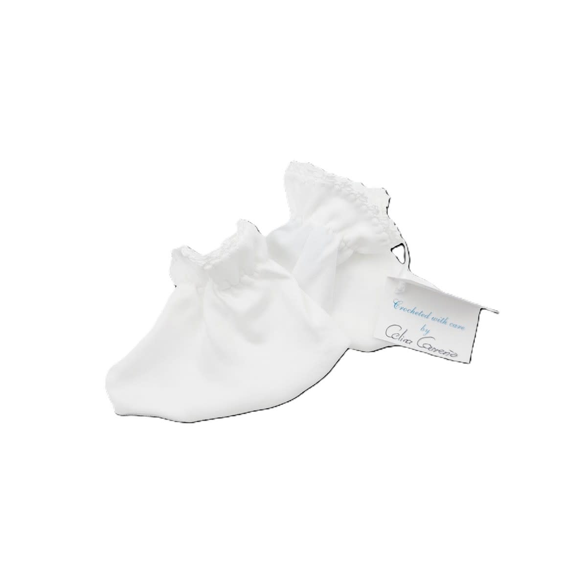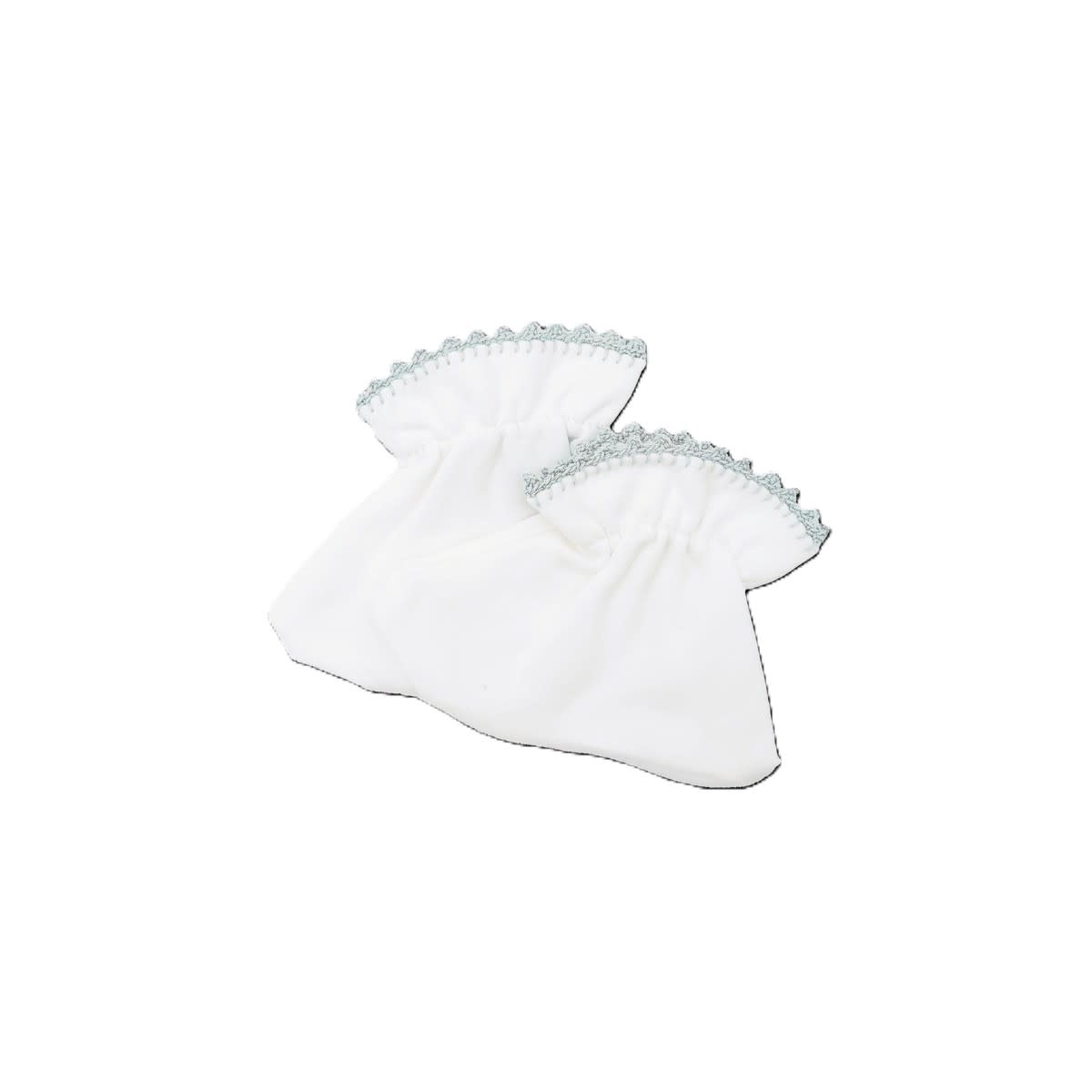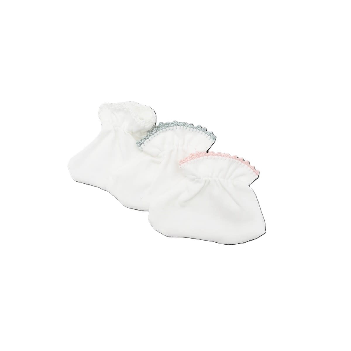 Our sack style bootie has elastic at the ankle for a secure fit and is accented with crochet trim at the cuff. Booties are sized 0-6 months.