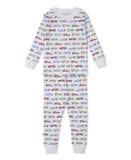 The Kissy Kissy Speedway PJ Set features a playful race car print on ultra-soft Pima cotton. Designed for comfort and style, this two-piece set includes a long-sleeve top and matching pants—perfect for cozy nights and little dreamers on the go.