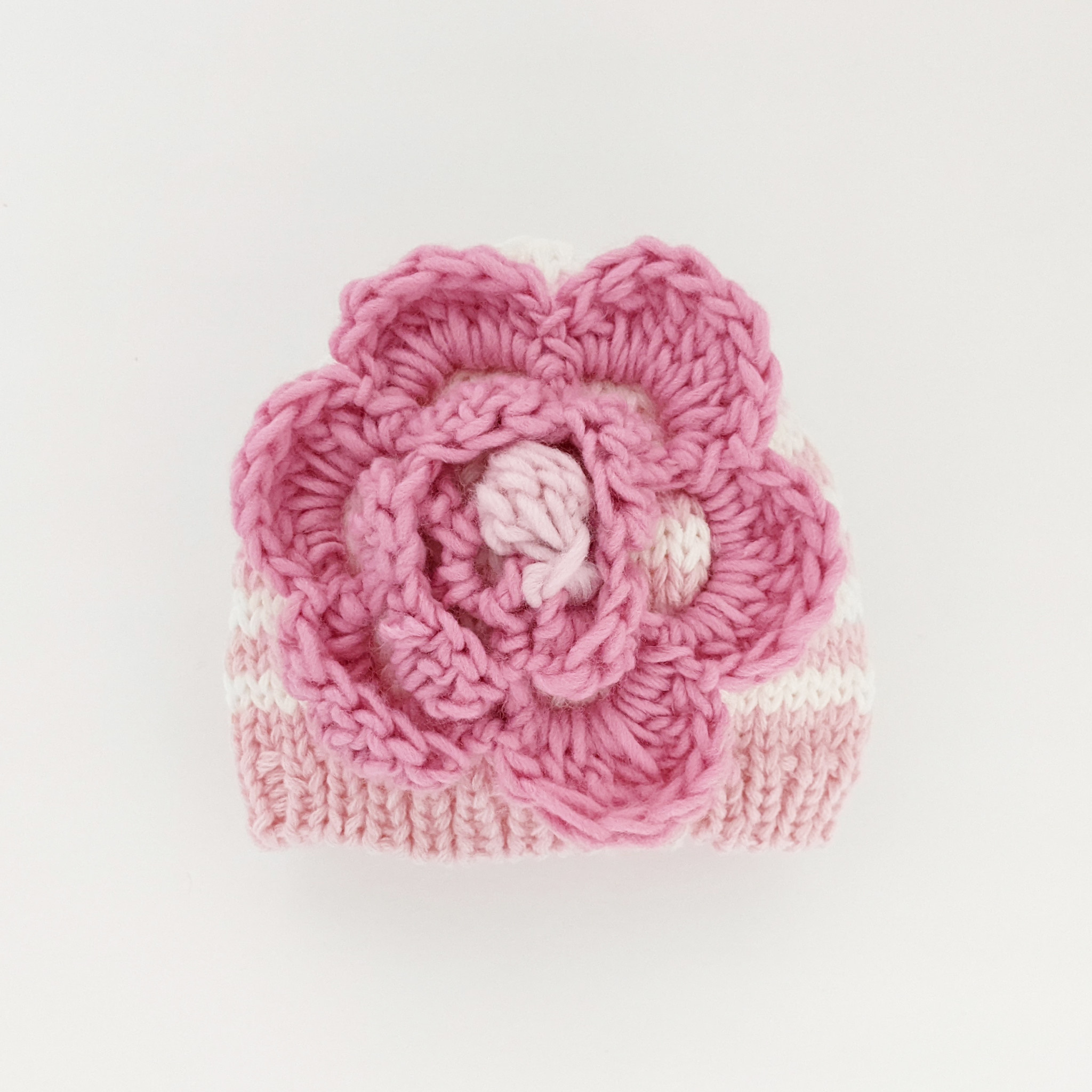 Soft pastel pink and cream striped hat for girls is accented with a large pink flower.