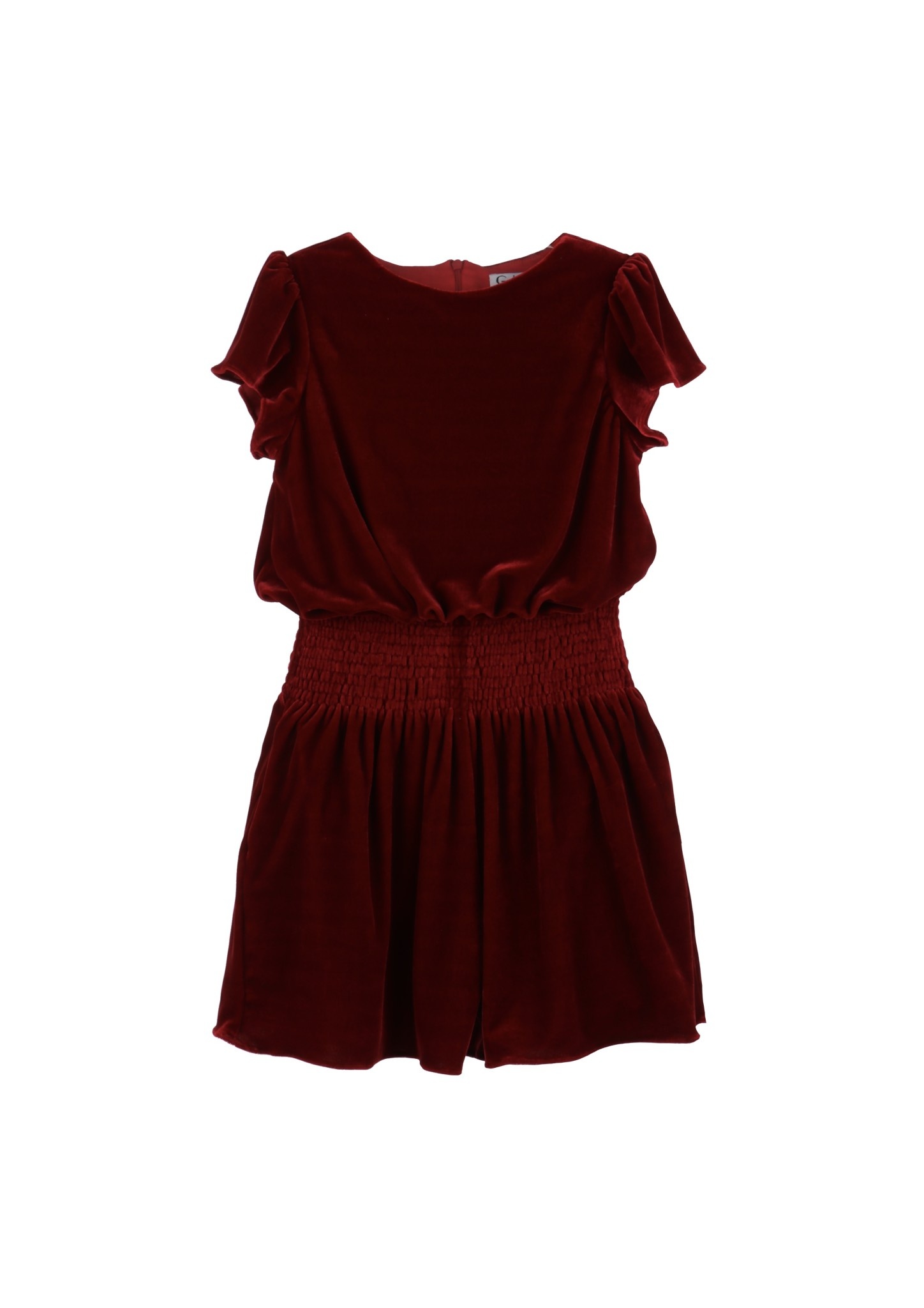 Rich and elegant, this burgundy velvet dress features flutter sleeves, a smocked waist, and a softly flowing skirt. Perfect for holiday gatherings, parties, or any special occasion that calls for timeless charm.