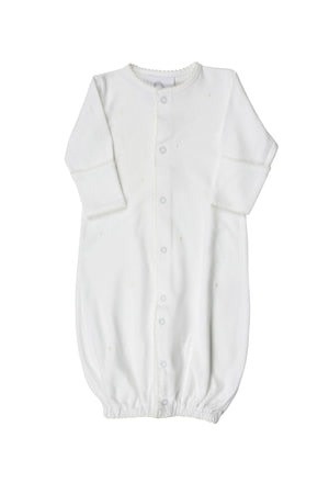 Layette pima gown with dots, elastic at bottom. A customer favorite! So classic and gets softer with each wash. 100% cotton. Buttons up front and mitten cuffs!